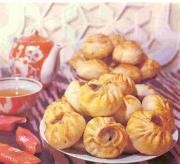 For the filling, combine finely chopped greens with chopped onions, cubed fat, salt and spices. To make dough, add water and salt to sifted flour, let stand for 30-40 minutes. Cut dough into 50 g (1-2 oz) pieces and roll out each piece into small flat rounds. Place a spoonful of filling in the center, pinch edges closed around the filling, and form a ball. Bake 30-40 minutes.