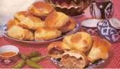 For the filling, combine finely diced (or minced) meat with chopped onions, salt and pepper. To make dough, combine water, oil, salt, sifted flour and yeast, let stand for 2-2 1/2 hours. Divide into 40-50 g (1/2-2 oz) balls. Roll out to a thickness of 3 mm (1/7 in) and place minced meat in the center. Fold dough up aroun filling, leaving a circular opening at the top. Place on greased pan, open side up, and let rise another 5-10 minutes. Coat with beaten egg and bake in pre-heated oven (200-240 C) for 8-10 minutes.