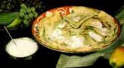 Make sauce by adding one cup flour to sweetened milk and cook until it thickens. To make dough, add water and salt to sifted flour. Allow to stand in warm place. Cut dough into 50 g (1-2 oz) pieces, roll out like flat bread and fry in butter. Coat top surface with milk sauce and fold into a half-moon.